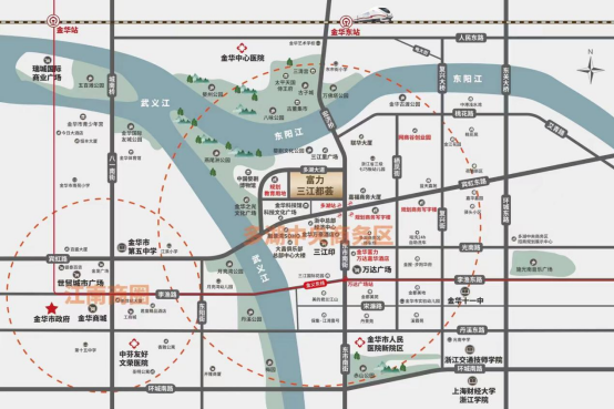 三江都荟商铺位于金华燕尾洲路与东市南街交汇处,这不仅是简单的“毗邻”,而是真正的“融入”。项目比邻万达广场、三甲金华新人民医院(在建)、总部经济中心、金华科技馆、金华一中等城市顶级配套资源。