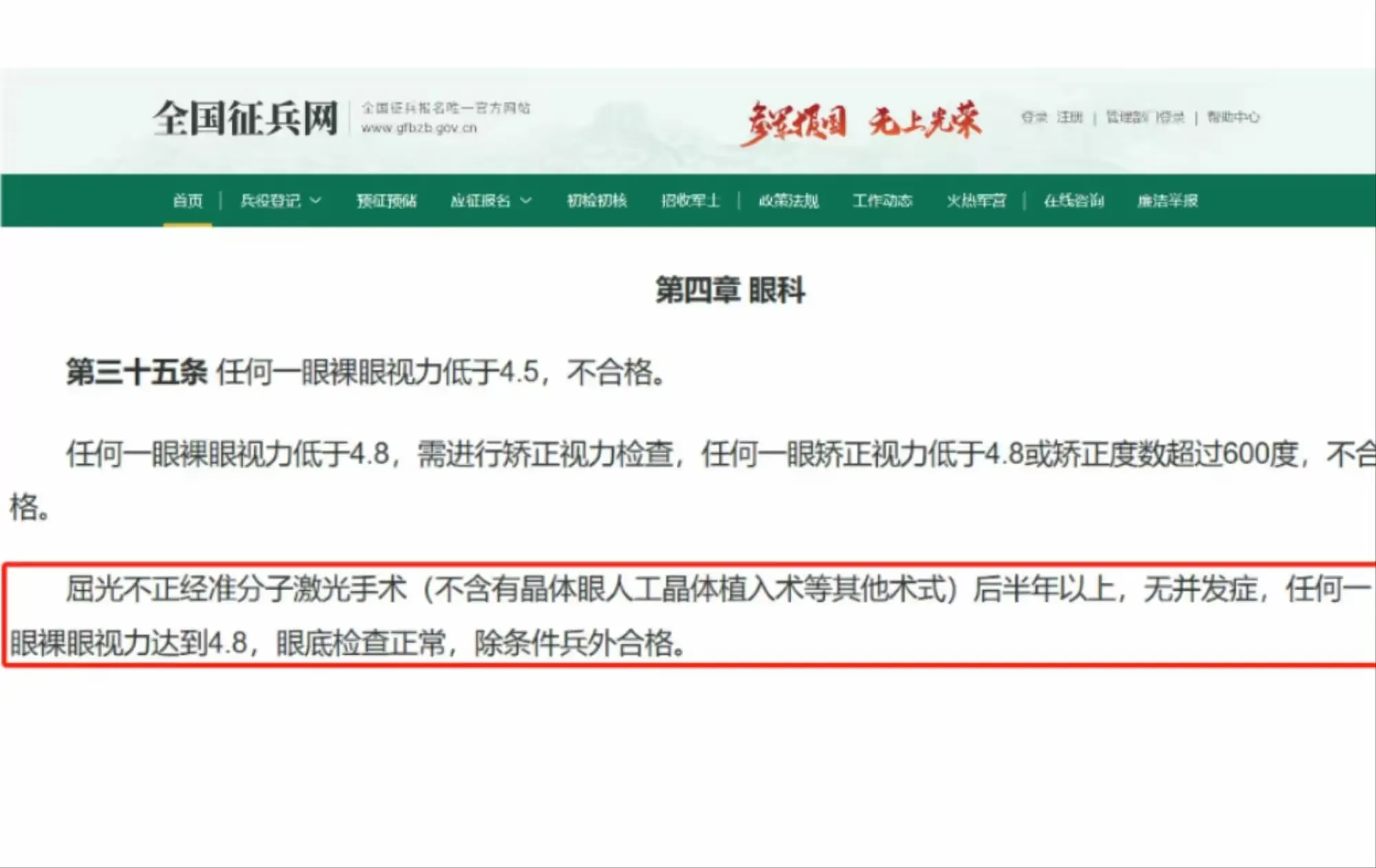 3.屈光不正经准分子激光手术(不含有晶体眼人工晶体植入术等其他术式)后半年以上,无并发症,任何一眼裸眼视力达到4.8,眼底检查正常,除条件兵外合格。