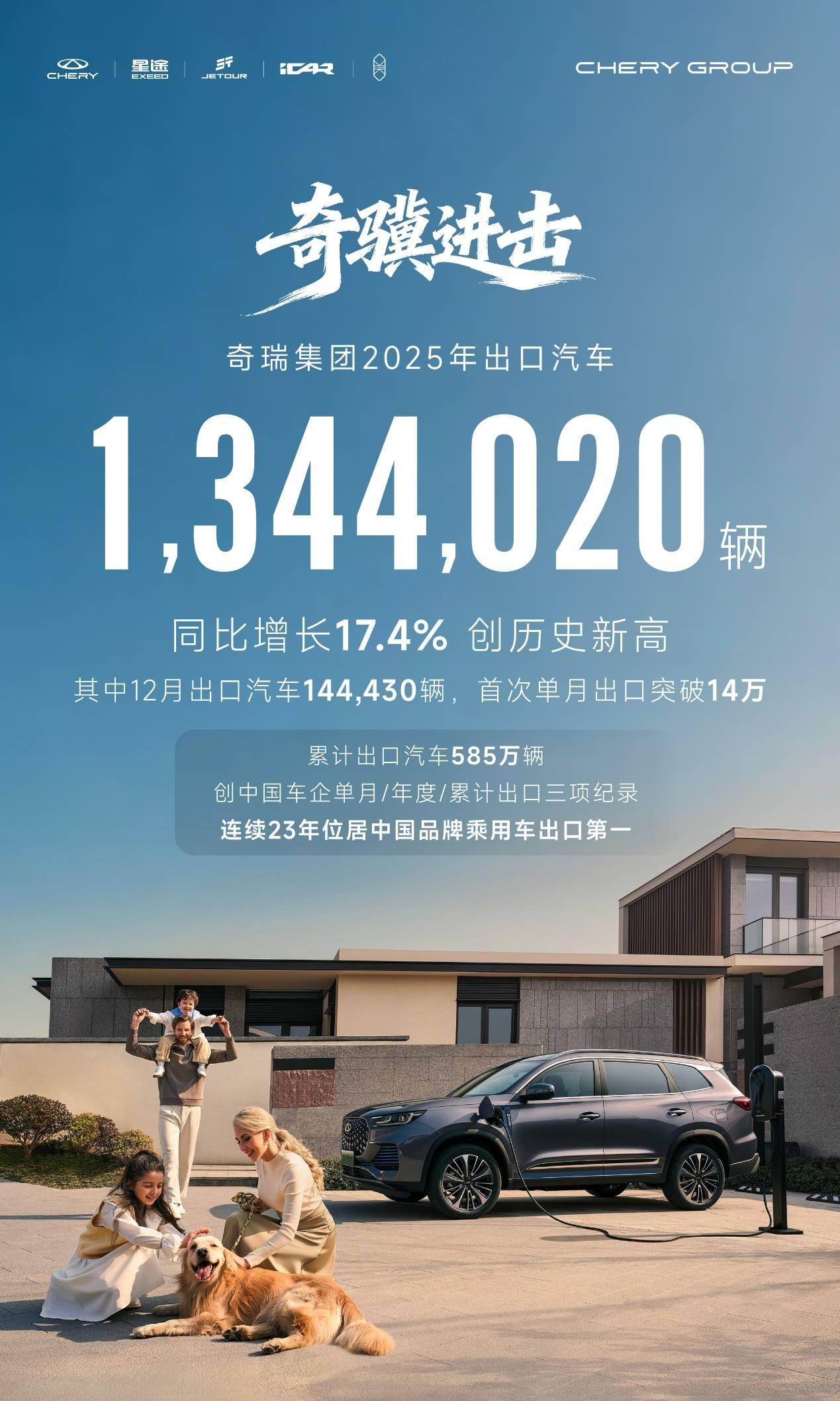 出口方面,奇瑞集团12月出口汽车144430辆,同比增长46.8%,首次单月出口超过14万辆,创造了新的历史纪录;全年出口汽车134.402万辆,同比增长17.4%;累计出口汽车585万辆,创造了中国车企单月出口、年出口、累计出口三项纪录,连续23年位居中国品牌乘用车出口第一。