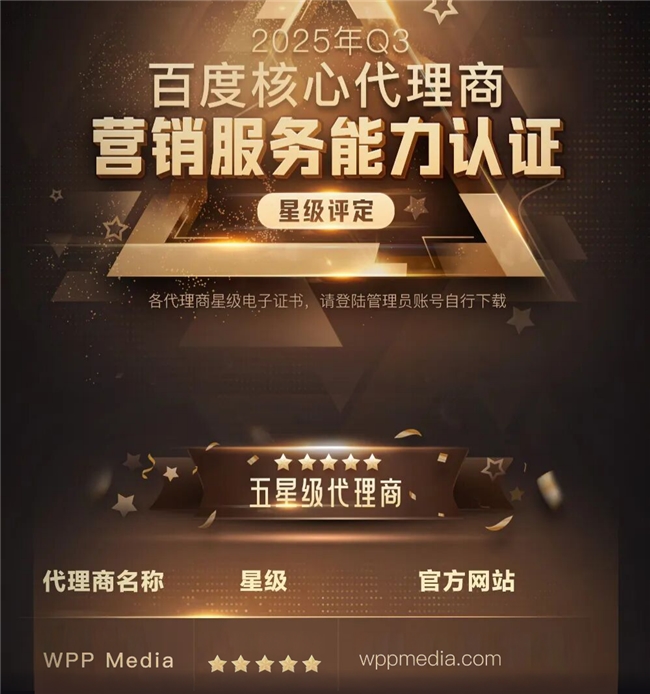 2025年Q3百度【核心代理商】营销服务能力认证结果正式揭晓,WPP Media(群邑)凭借卓越的专业实力与出色的服务水平,再度脱颖而出,成功蝉联百度核心代理商 - 五星代理商认证,也是唯一一家位列五星的国际4A媒介代理公司,这一成绩再次彰显了其在行业内的领先地位。